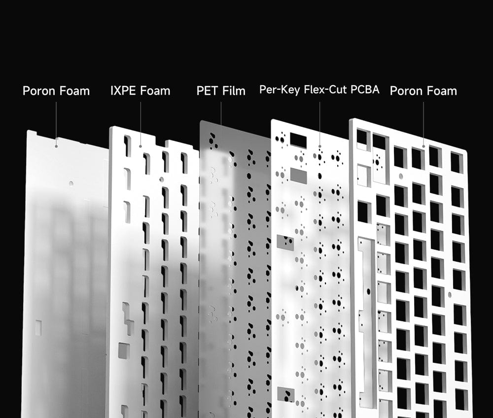 Elevate your typing experience with the 1.2 mm Per-Key Flex-Cut PCB. This cutting-edge technology offers a softer, more resilient feel and stable key presses. Combined with the Flex-Cut PC plate, it minimizes typing noise and provides uniform backlighting, resulting in a quieter and more refined typing experience.