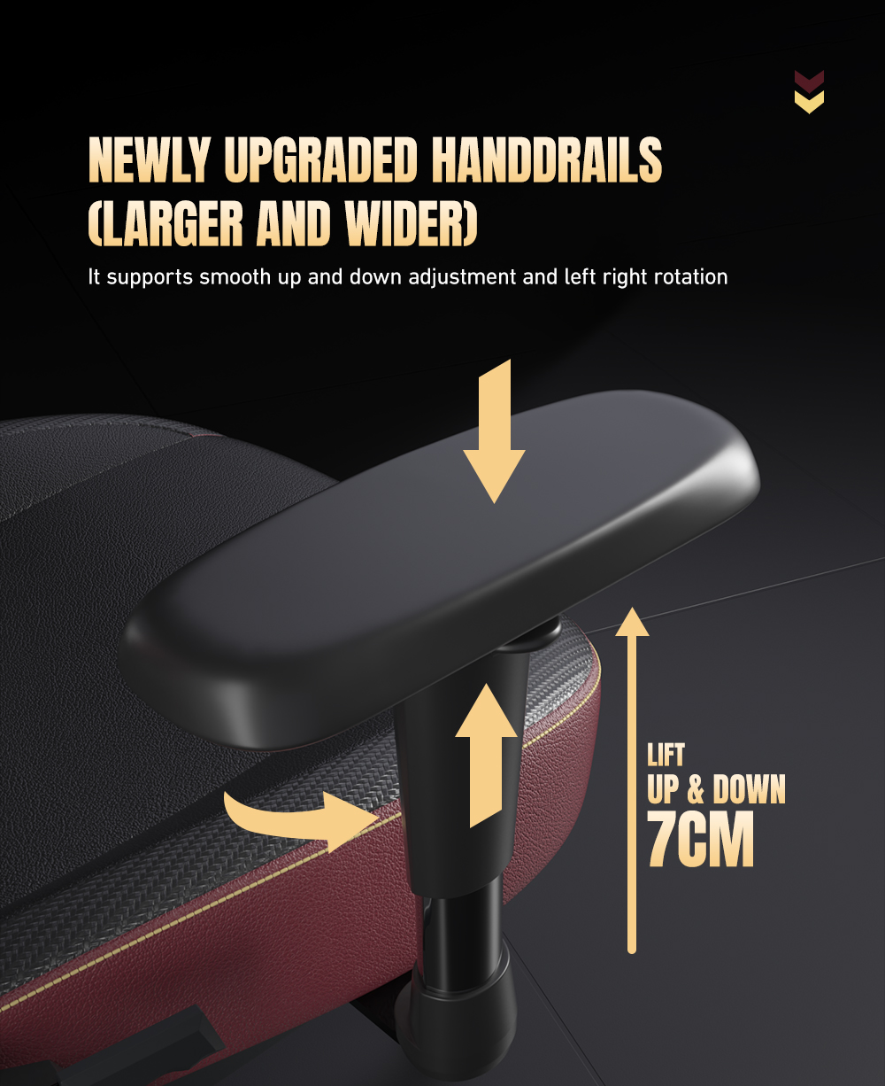 • Adjustable 2D armrests (height + rotation)